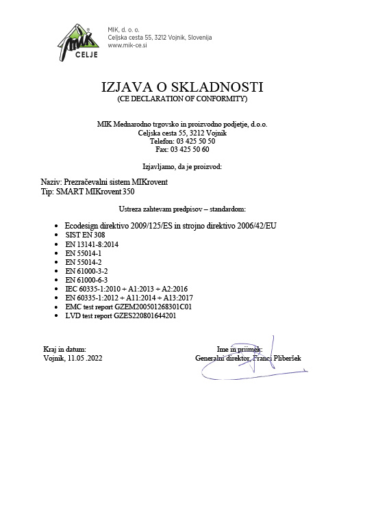 Z nakupom MIKrovent 350 dobi stranka napravo s senzorskim upravljalnikom za temperaturo, vlago, CO2, CO in VOC, prav tako komplet filtrov (notranji in zunanji), daljinski upravljalnik, ter ves potreben material za montažo, vključno s cevmi in stiroporjem.